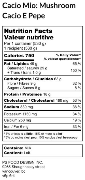 Hover For Ingredients Mushrooms, gluten free flour (garbanzo bean flour, potato starch, tapioca flour, white sorghum flour, fava bean flour), butter, heavy cream, garlic, black pepper, salt, parsley, parmesan cheese, gluten free bow tie pasta (corn flour, rice flour), herbs & spices5.00 out of 5$17.25 Read more Login or Register to BuyGluten free bow tie pasta tossed in our house made cacio e Pepe sauce with roasted mushrooms, parmesan and cream