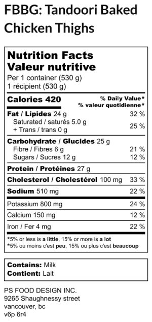 Hover For Ingredients Chicken thigh, olive oil, lemon juice, ginger, garlic, garam masala, paprika, turmeric, cumin, coriander, cayenne, salt, pepper, Greek yoghurt, mint, filtered water, cucumber, Roma tomato, red onion, red bell pepper, herbs & spices0 out of 5$19.25 Read more Login or Register to BuyTandoori Baked Chicken Thighs – tender chicken thigh marinated for 24 hours with our house made tandoori spice blend, served with Mediterranean veggies and yoghurt mint sauce.