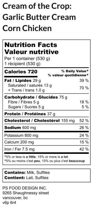 Hover For Ingredients Rossdown halal chicken thigh, olive oil, thyme, pork bacon, onion, butter, corn, asparagus, garlic, chili flakes, white wine heavy cream, parmesan cheese, basil, salt, black pepper, white jasmine rice, herbs & spices0 out of 5$17.25 Read more Login or Register to BuyRossdown Chicken Thighs marinated and baked with fresh basil, garlic, chilis, white wine, herbs, bacon, corn & cream over white jasmine rice with asparagus