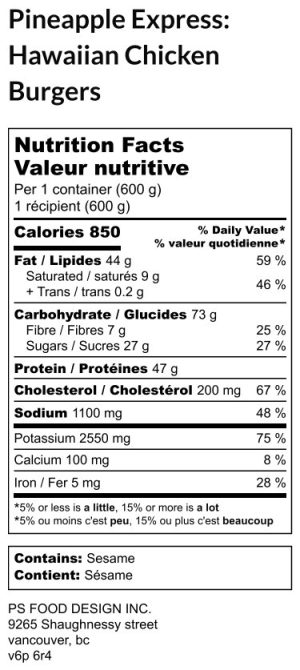Hover For Ingredients Ground chicken, ginger, garlic, organic raw coconut sugar, tomato puree, sesame oil, salt, black pepper, avocado, tahini, apple cider vinegar, lemon juice, basil, olive oil, parsley, green onion, cayenne pepper, maple syrup, water, coconut water, corn, red bell pepper, pineapple, golden potatoes, Italian seasonings, herbs & spices5.00 out of 5$17.25 Read more Login or Register to Buy2 delicious house made Hawaiian chicken burgers with avocado goddess sauce, roasted potatoes & grilled medley of corn, red bell pepper & pineapple