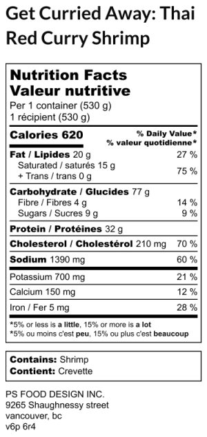 Hover For Ingredients Shrimp, coconut milk, red curry paste (dried red chili, lemongrass, garlic, shallot, salt, kaffir lime peel, galangal, coriander seed, cumin powder), cornstarch, rice vinegar, gluten free tamari, zucchini, Thai basil, red bell pepper, organic raw coconut sugar, onion, garlic, ginger, lime juice. Lime zest, white rice, parsley, lemon, herbs & spices0 out of 5$17.25 Read more Login or Register to BuyCozy Red Thai Shrimp curry with zucchini, coconut milk, Thai basil, fresh ginger, red bell pepper and your favourite curry spices over white jasmine rice