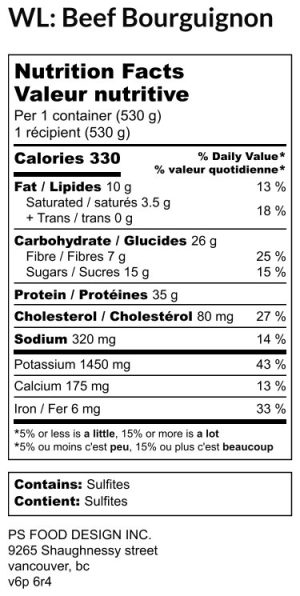 Hover For Ingredients AAA sirloin strips, mushrooms, walnuts, carrots, Spanish onion, garlic, red wine, house made vegetable stock, tomato paste, thyme, chickpea flour, cornstarch, olive oil, vegan butter, salt, black pepper, zucchini noodles, herbs & spices0 out of 5$19.25 Read more Login or Register to BuyDescription:AAA sirloin strips simmered with red wine, tomatoes, root veggies, walnuts, mushrooms and herbs served with fresh zucchini noodles