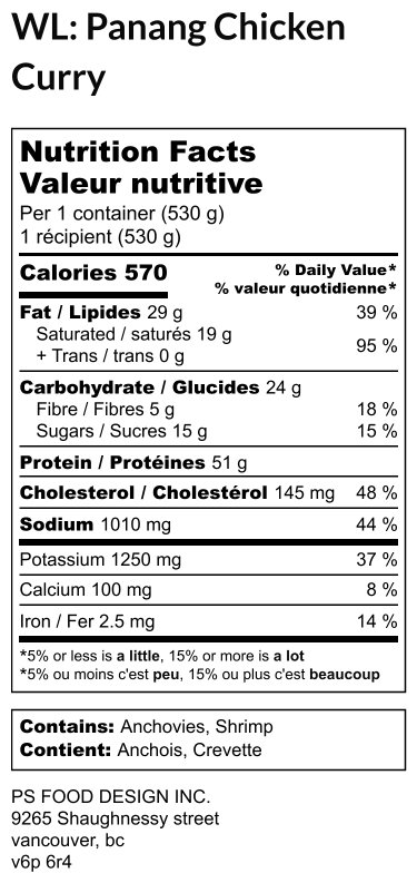 Hover For Ingredients Rossdown halal chicken breast, panang curry paste (Dried red chili, lemongrass, shallots, salt, garlic, galangal, mung bean, shrimp paste (shrimp, salt), kaffir lime peel, coriander seed, cumin, pepper), filtered water, coconut milk, lemon zest, organic raw coconut sugar, fish sauce (anchovy extract 68%, salt, sugar), olive oil, basil, lime juice, cauliflower, herbs & spices0 out of 5$19.25 Read more Login or Register to BuyDescription:Rossdown halal chicken breast, simmered in our creamy coconut panang curry sauce with fresh basil & lime over cauliflower rice