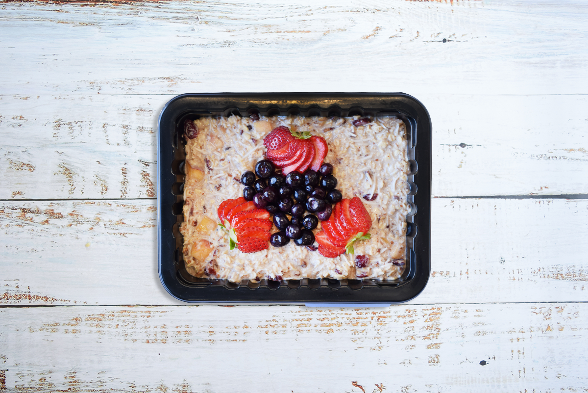 Organic gluten free oats, pecans, dried cranberries, shredded coconut, ground flaxseed, cinnamon, salt, peaches, Greek yoghurt, lemon juice, vanilla extract, strawberries, blueberries