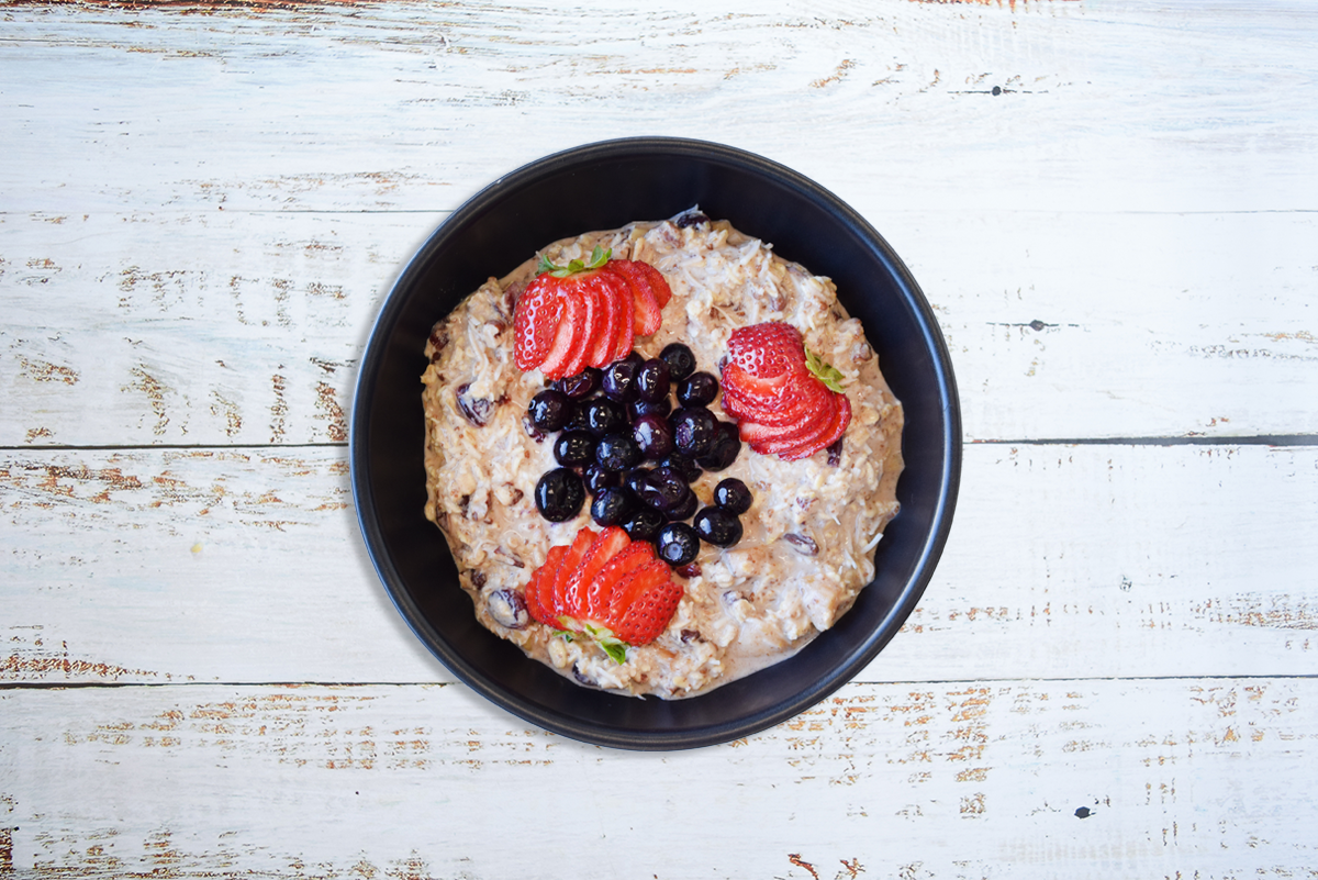 Organic gluten free oats with fresh peaches, dried cranberries, flax, Greek yoghurt, pecans, cinnamon and vanilla topped with fresh strawberries & blueberries