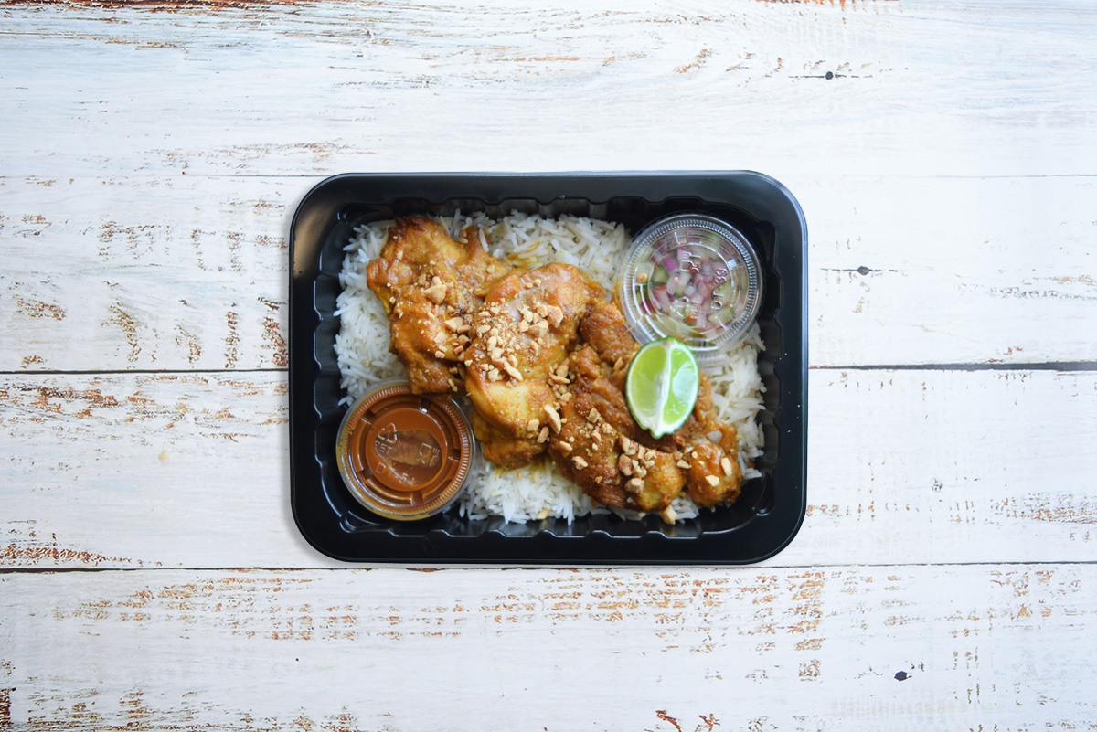 Rossdown halal chicken thigh, coconut milk, curry powder, organic raw coconut sugar, red curry paste (dried red chili, lemongrass, garlic, shallot, salt, kaffir lime peel, galangal, coriander seed, cumin powder), salt, organic peanut puree, gluten free tamari, honey, ginger, apple cider vinegar, cayenne pepper, cucumber, red onion, chili flakes, white vinegar, organic agave, white jasmine rice, peanuts, lime, herbs & spices