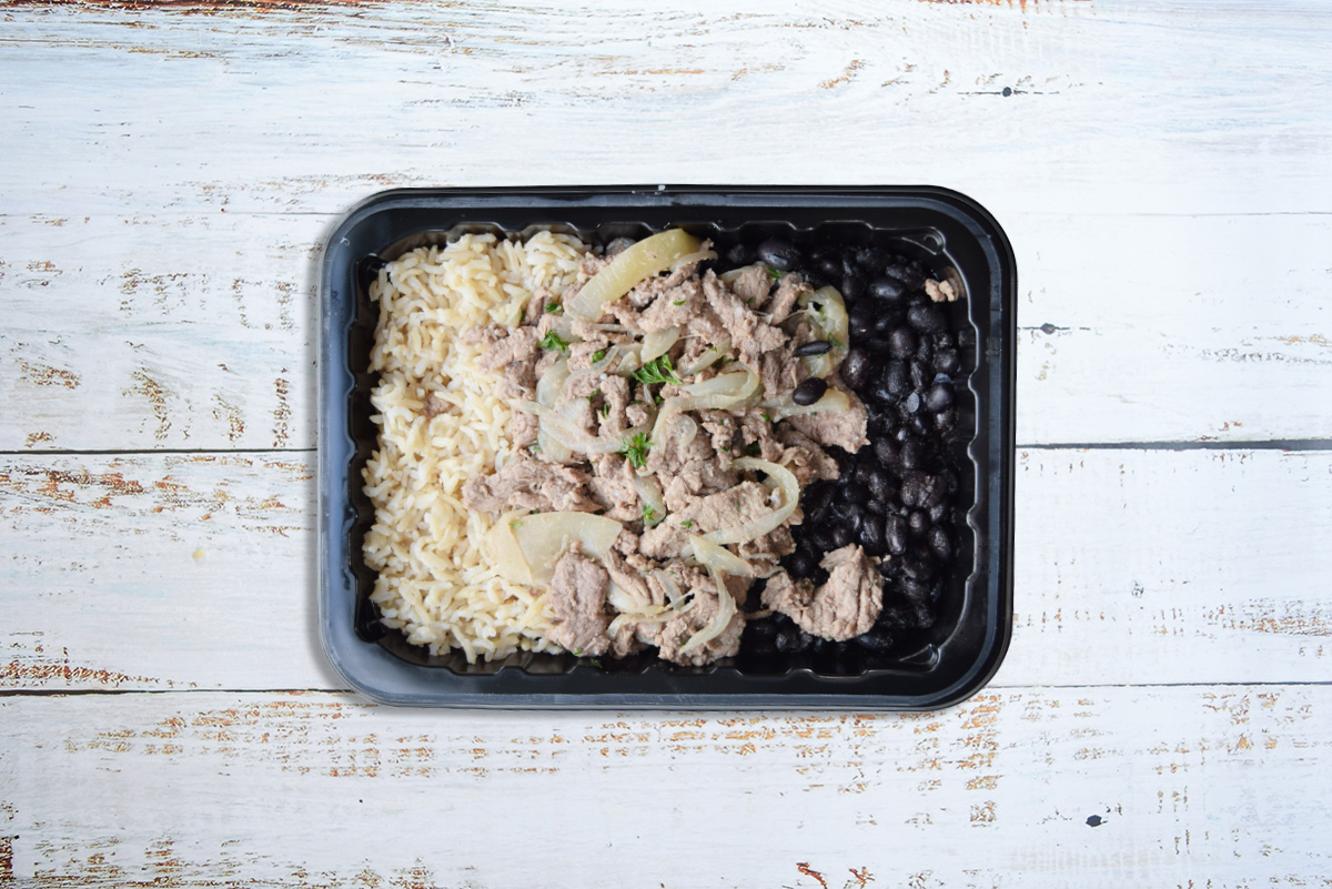 AAA sirloin strips sautéed with Spanish onion, garlic & savour spices service with Brazilian baked black beans & brown jasmine rice