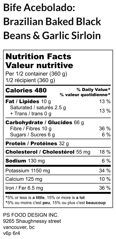 AAA sirloin strips, steak spices, garlic onion, baked black beans (black beans, Spanish onion, tomato puree, red bell pepper, bay leaves, garlic powder), brown jasmine rice, parsley, herbs & spices