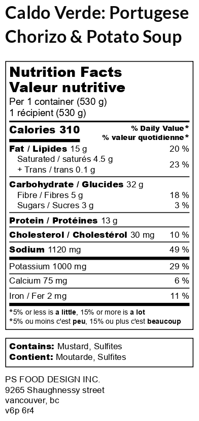 Golden potatoes, garlic, onion, olive oil, salt, filtered water, kale, gluten free chorizo (pork, sugars (glucose solids), salt, spices (mustard), dehydrated red bell pepper, red wine, potassium phosphate, garlic, water, sodium erythorbate, bacterial culture, sodium nitrite), herbs & spices