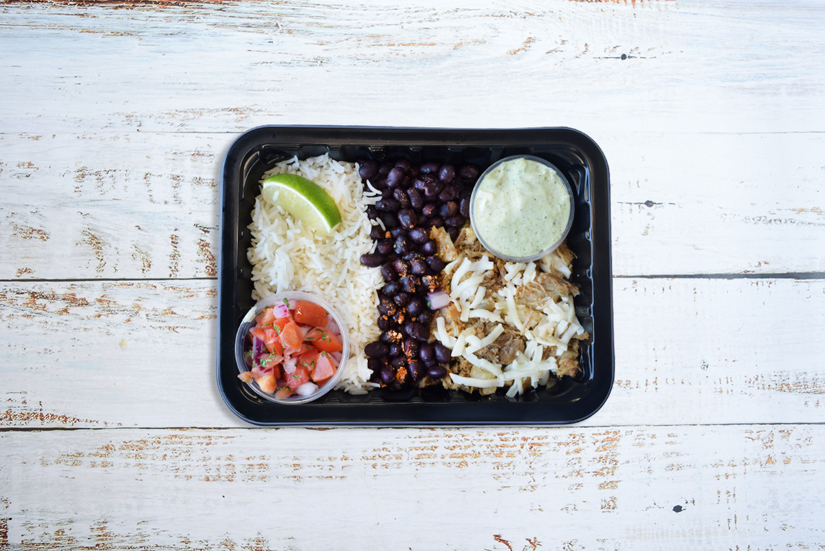 Delicious pulled pork with house baked black beans, white jasmine rice, fresh tomato salsa, mozzarella cheese, lime & hearty green aioli