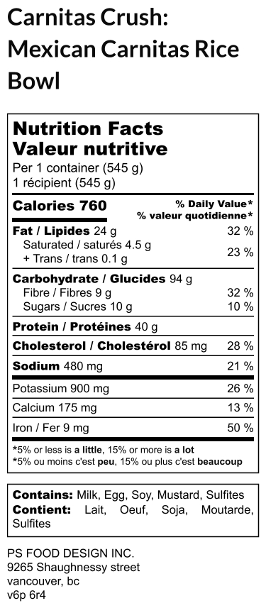 Pulled pork, onion, garlic, black pepper, paprika, olive oil, black beans, tomato puree, red bell peppers, bay leaves, Roma tomato, red onion, parsley, red wine vinegar, salt, light mayonnaise (water, soybean oil, modified cornstarch, sugar, corn, maltodextrin, liquid whole egg, vinegar, salt, liquid egg yolk, mustard, lactic acid, potassium sorbet, phosphoric acid, dried onion, dried garlic, calcium disodium EDTA, spice), green sauce (Mayonnaise (Soybean Oil, Vinegar, Eggs, Water, Salt, Egg Yolks, Sugar, Calcium Disodium EDTA, Dried Garlic, Dried Onions, Natural Flavors), Milk, Cilantro, Onion, Cheese Cultures, Serrano Peppers, Garlic, Guar Gum, Salt, Spices), lime, mozzarella cheese