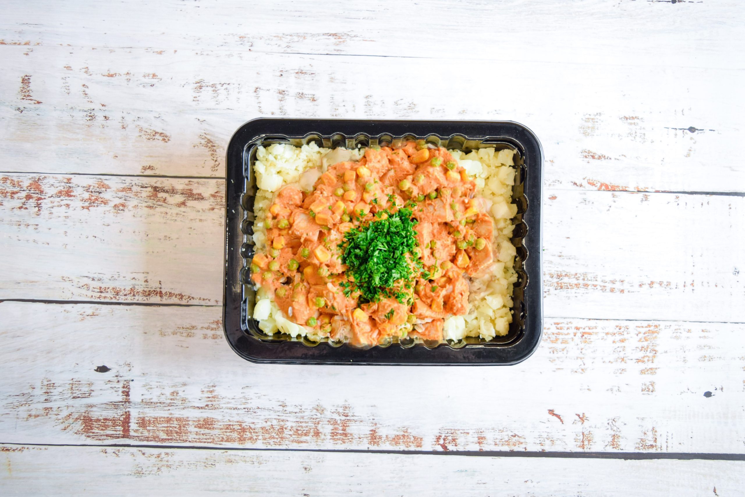 Rossdown Halal chicken breast, green peas, corn, coconut milk, sriracha, tomato puree, tomato sauce, yellow mustard, gluten free Worcestershire sauce, herbs & spices