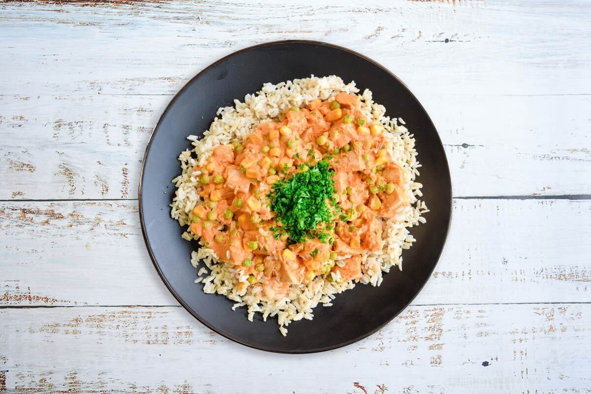 Tender Rossdown Halal chicken breast simmered with coconut milk, sriracha, tomato puree, corn, peas & spices over white jasmine rice