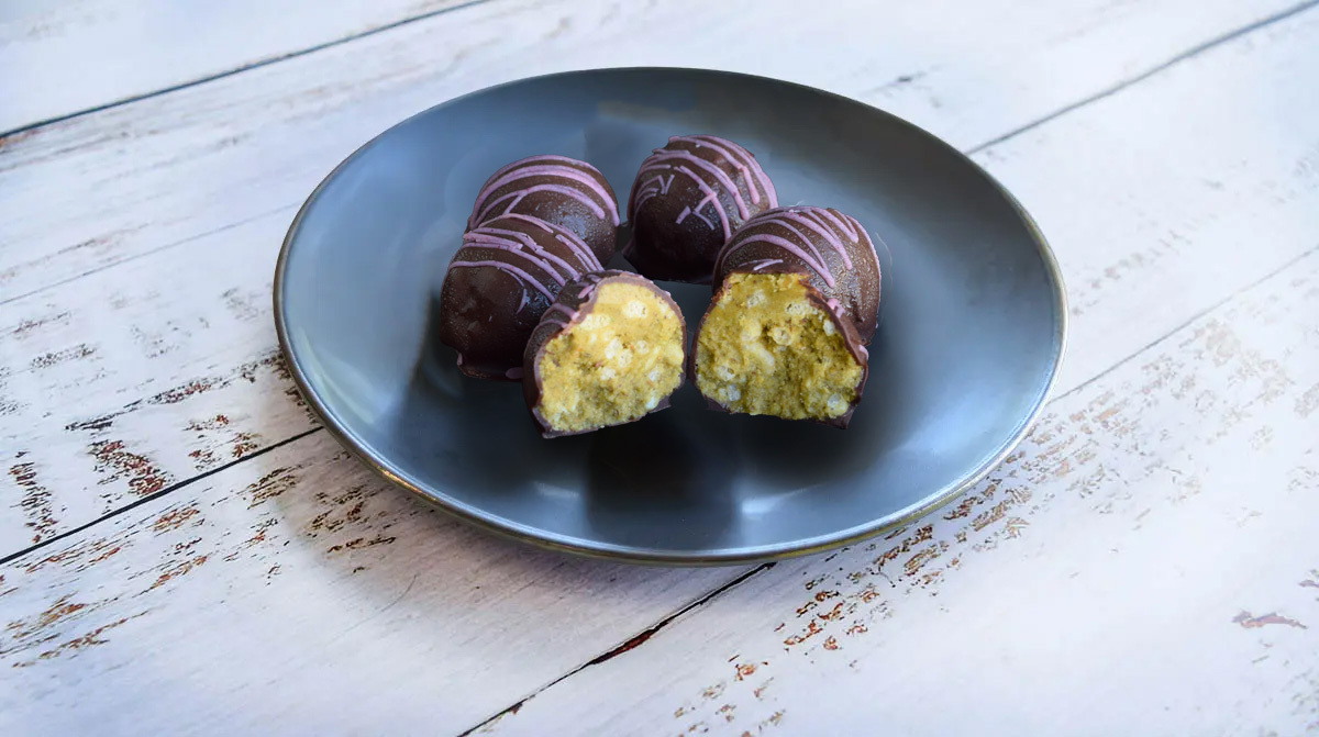 House made creamy pistachio butter rolled with organic crispy puffed rice, shredded coconut, swerve & clean whey isolate protein dipped in dark chocolate with decadent white chocolate drizzle