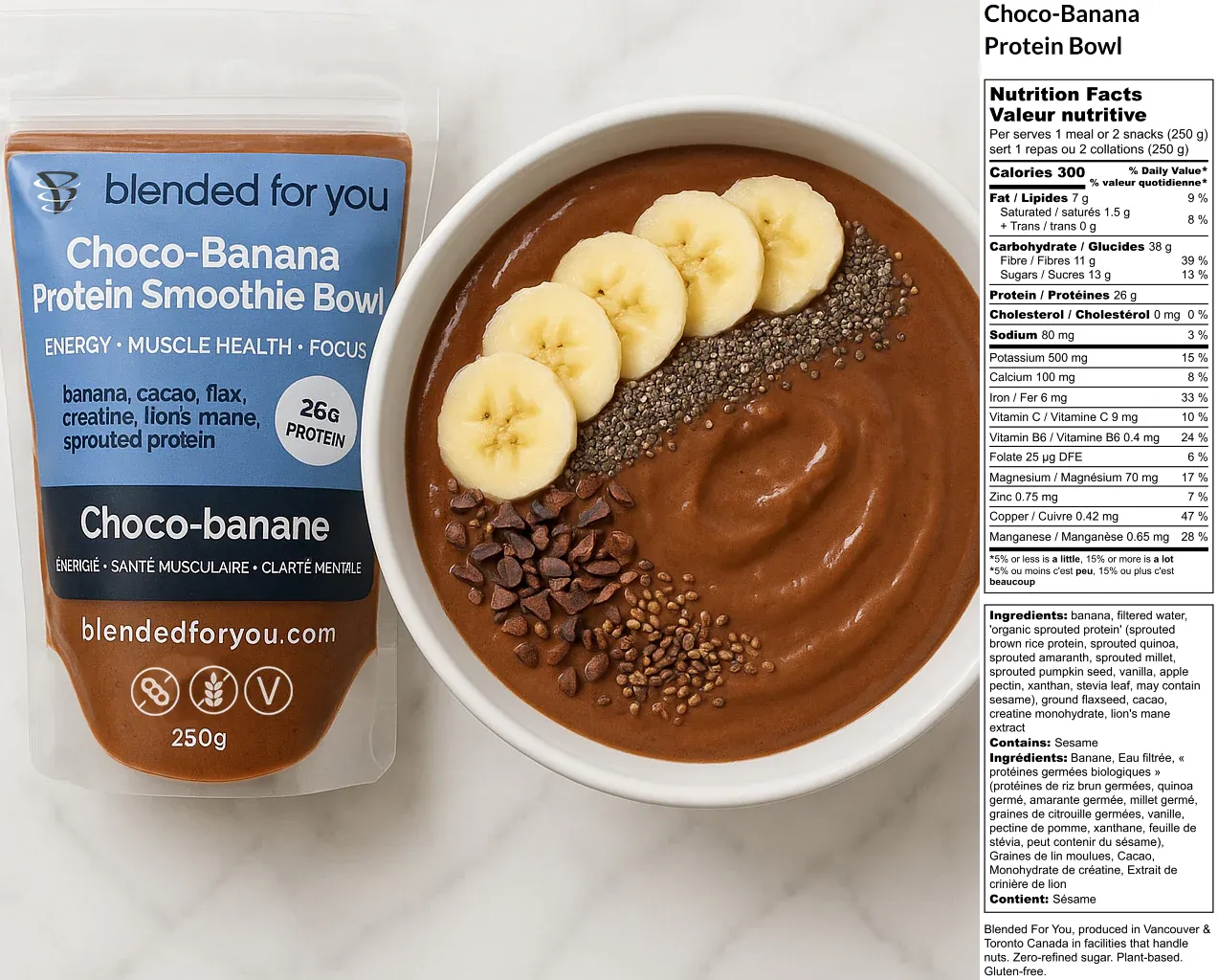 banana, cacao, flax, creatine, lion’s mane, sprouted protein