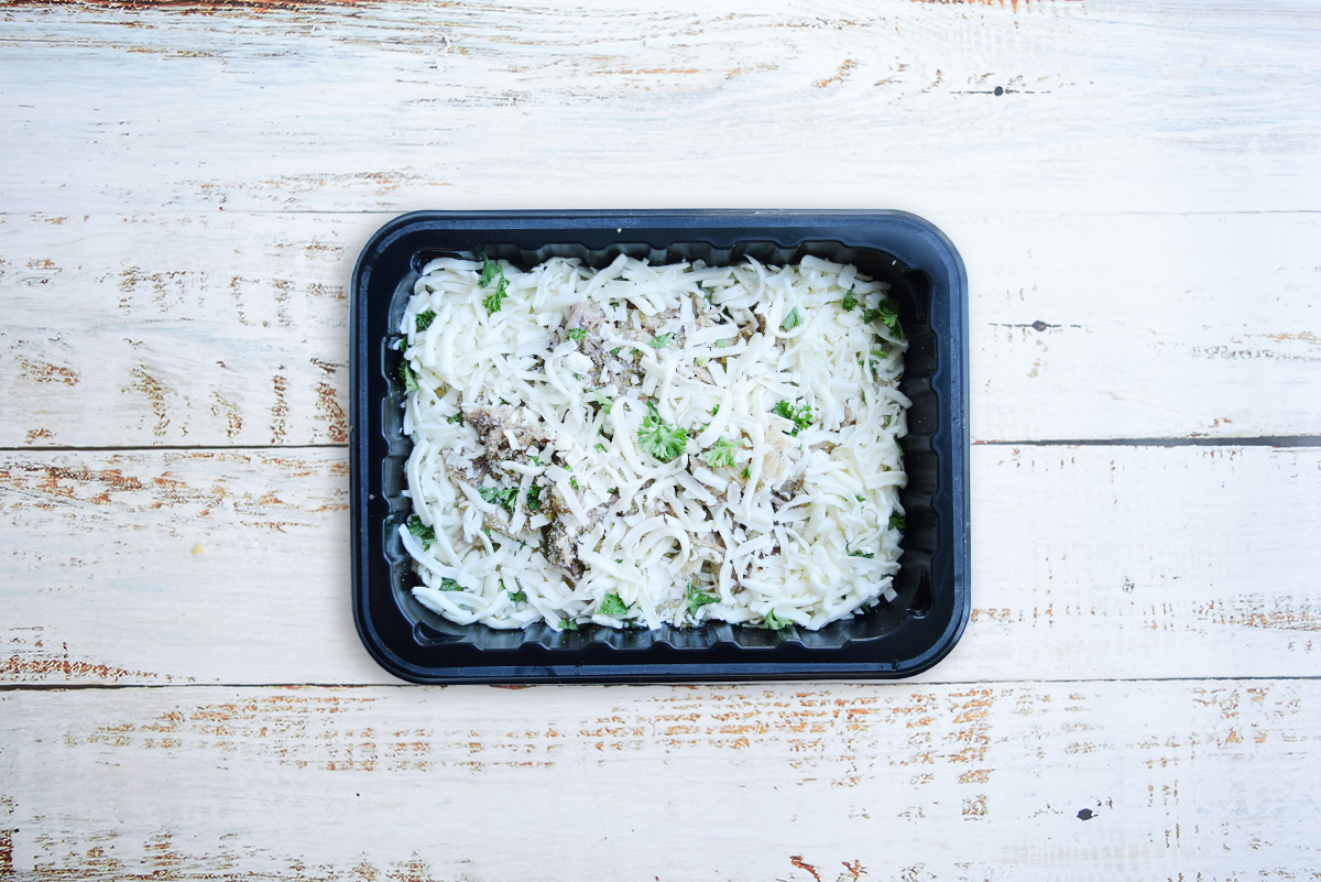 Beef brisket, onion, garlic, olive oil, cassava, vegan butter, coconut milk, organic unsweetened almond milk, mozzarella cheese, salt, pepper, herbs & spices