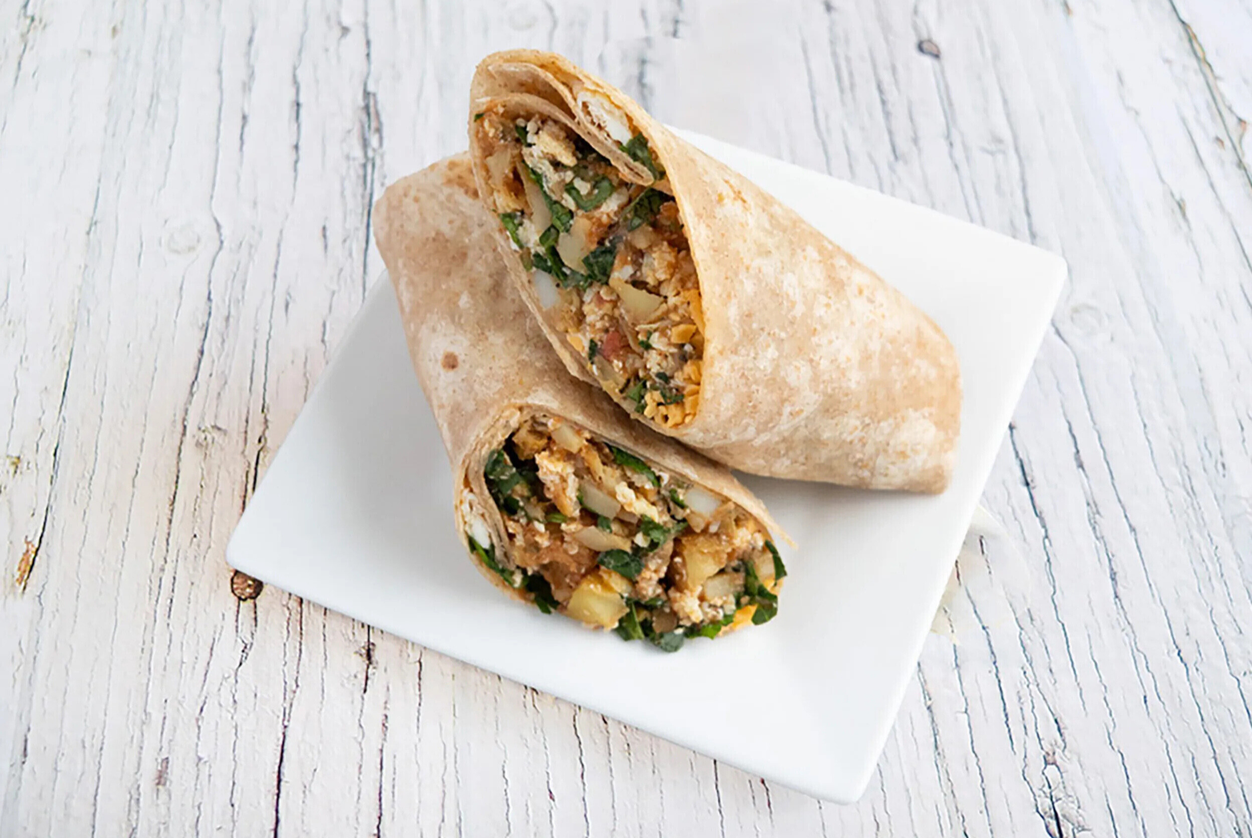 Free range scrambled eggs tossed with our salsa roja aioli, fresh organic spinach, Italian roasted golden potatoes and shredded cheddar cheese wrapped up in a tasty 12 inch whole wheat tortilla