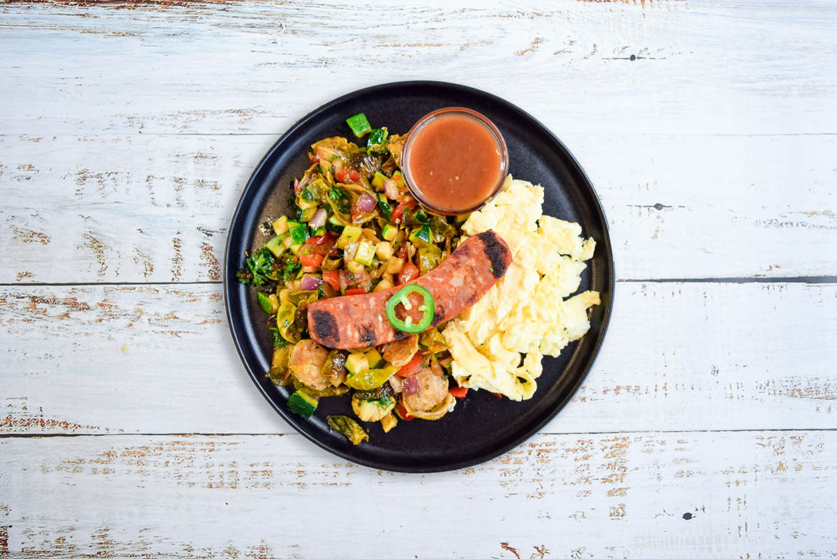 Juicy gluten free chorizo over tex mex roasted veggie medley of brussel sprouts, red bell pepper, zucchini & red onion with free range eggs, fresh jalapeño & salsa roja. Only 11g of net carbs!