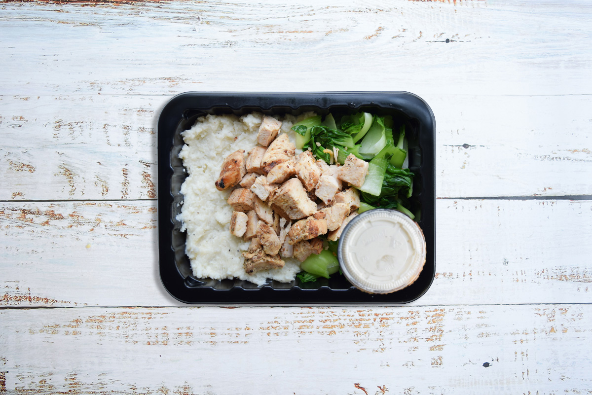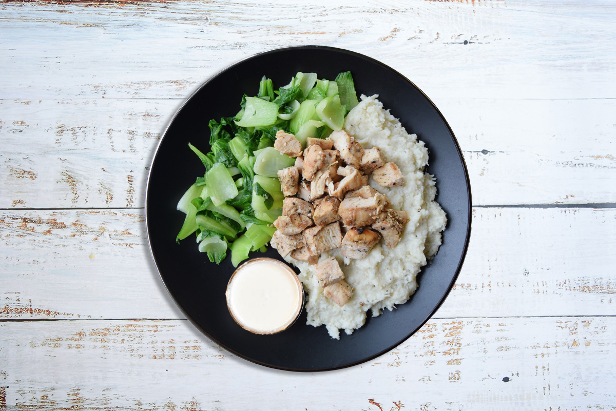 Chicken breast, garlic & herb seasonings, cauliflower, vegan butter, garlic, dijon mustard, black pepper, salt, bok choy, cashew cream (cashews, coconut milk, lemon juice, filtered water, salt), herbs & spices