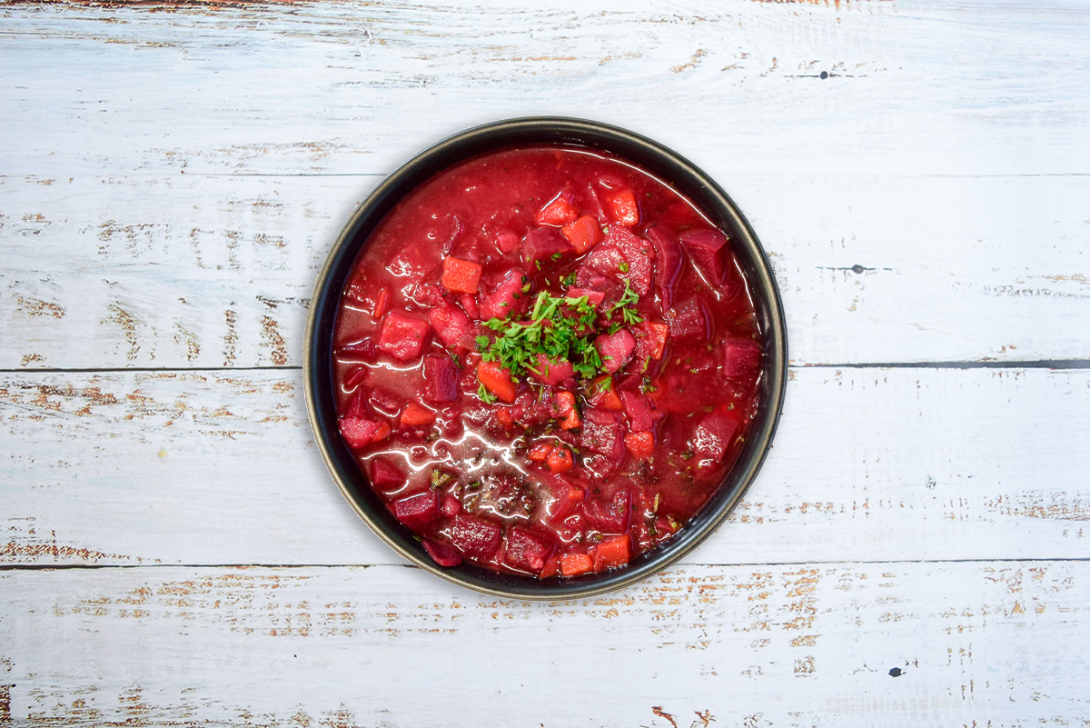 Carrots, red beets and golden potatoes slow cooked with Spanish onion, olive oil, house made veggie stock, cabbage, tomato puree, fresh garlic and herbaceous spices