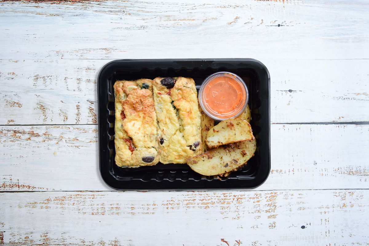 Mediterranean inspired mini breakfast frittatas baked with baby spinach, grape tomatoes, Kalamata olives, feta & spices served alongside Greek roasted potatoes and our house made roasted red pepper & feta dip