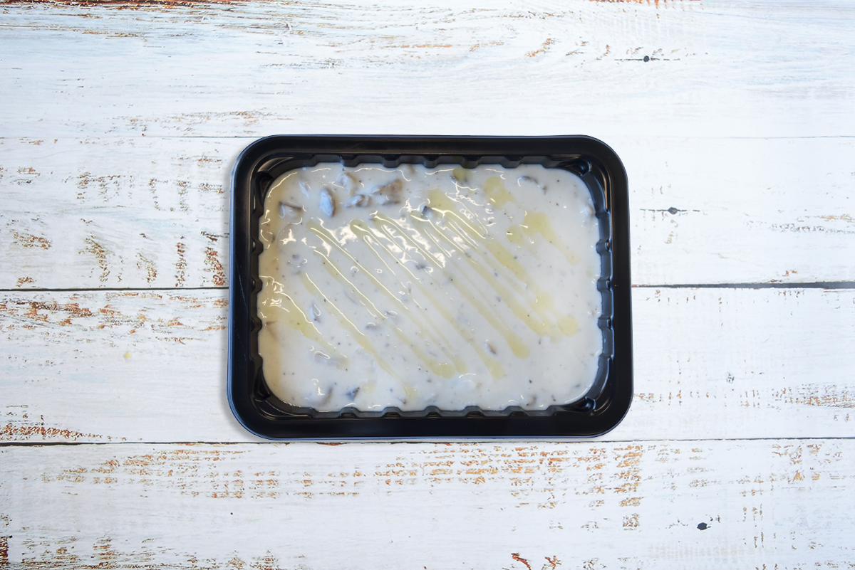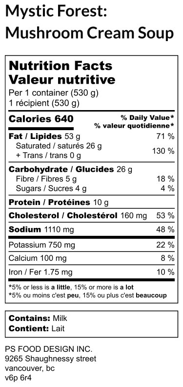 Mushrooms, onion, parsley, salt. Filtered water, Gluten free flour (garbanzo bean flour, potato starch, tapioca flour, white sorghum flour, fava bean flour), black pepper, vegan butter, heavy cream, white truffle oil, herbs & spices
