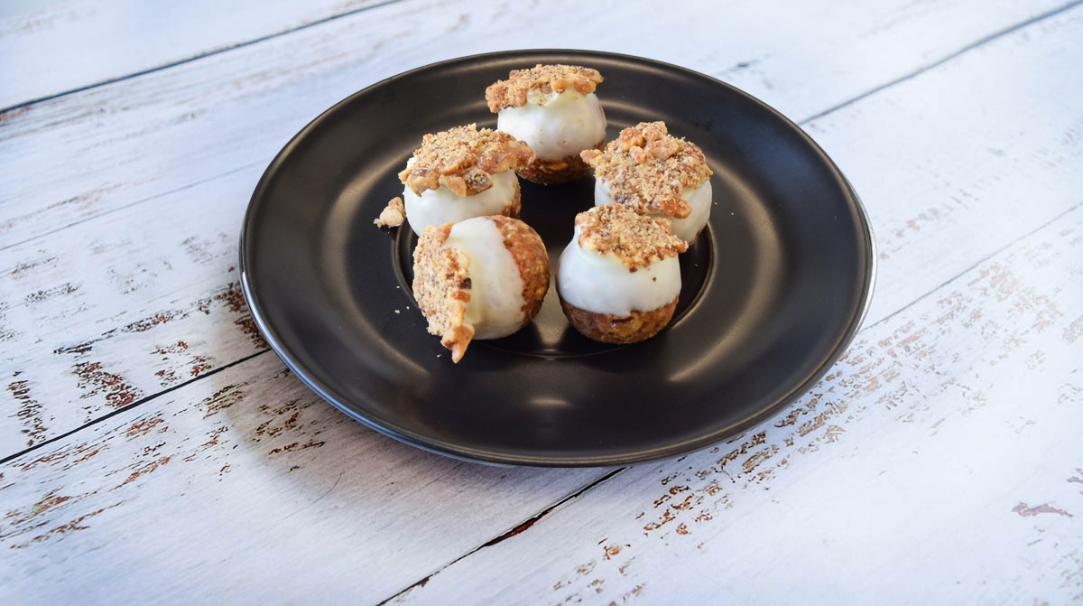 Shredded carrots rolled together with dates, gluten free organic oats, clean vegan protein, almond butter & your favourite carrot cake spices, dipped in white chocolate and topped with crushed walnuts. (Package of 5)