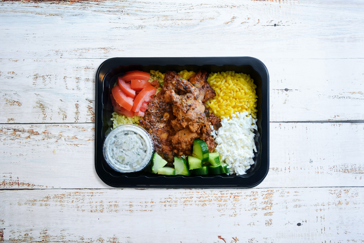 Rossdown halal chicken thigh, Greek yogurt, olive oil, garlic, smoked paprika, onion, oregano, chili flakes, salt, black pepper, lemon juice, fresh dill, cucumber, feta cheese, tomatoes, parsley, mint, onion, white jasmine rice, herbs & spices