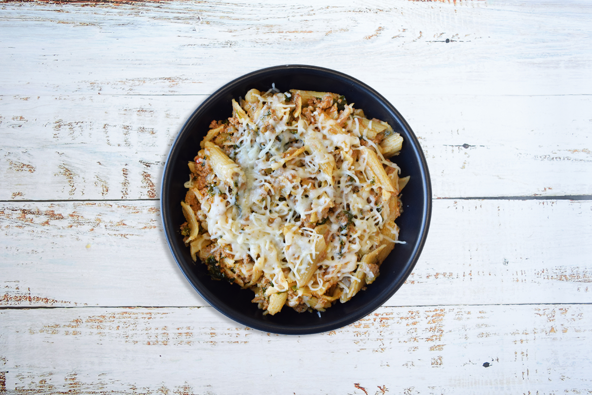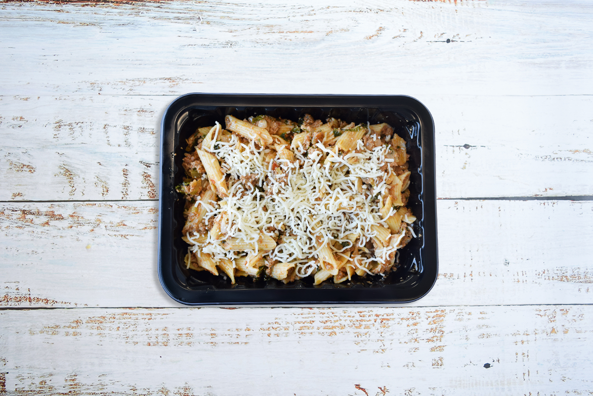 Lean ground beef sautéed with fresh garlic, celery, tomatoes, white wine, coconut milk, parmesan, chilis & spices served over gluten free penne pasta