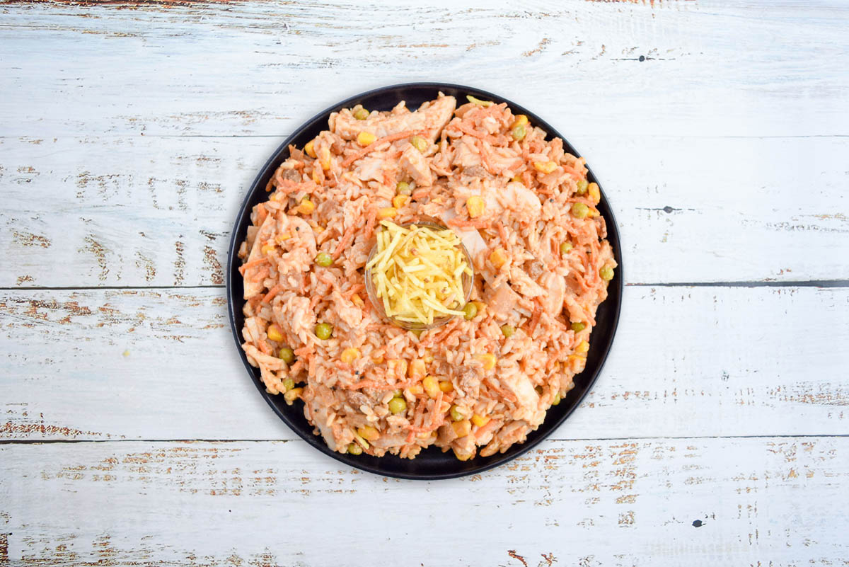 Tender shredded chicken thigh baked with green peas, corn, tomato puree, creamy coconut milk, carrots, raisins, house made veggie stock, Spanish onion, brown jasmine rice and herbs, topped with batata palha (gluten free hickory sticks