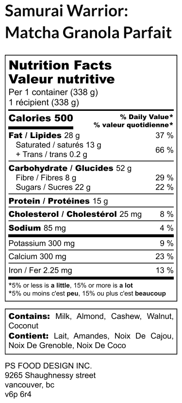 Organic gluten free oats, almonds, cashews, walnuts, organic coconut oil, shredded coconut, organic matcha powder, organic maple syrup, organic agave, vanilla extract, roasted berries, Greek yoghurt