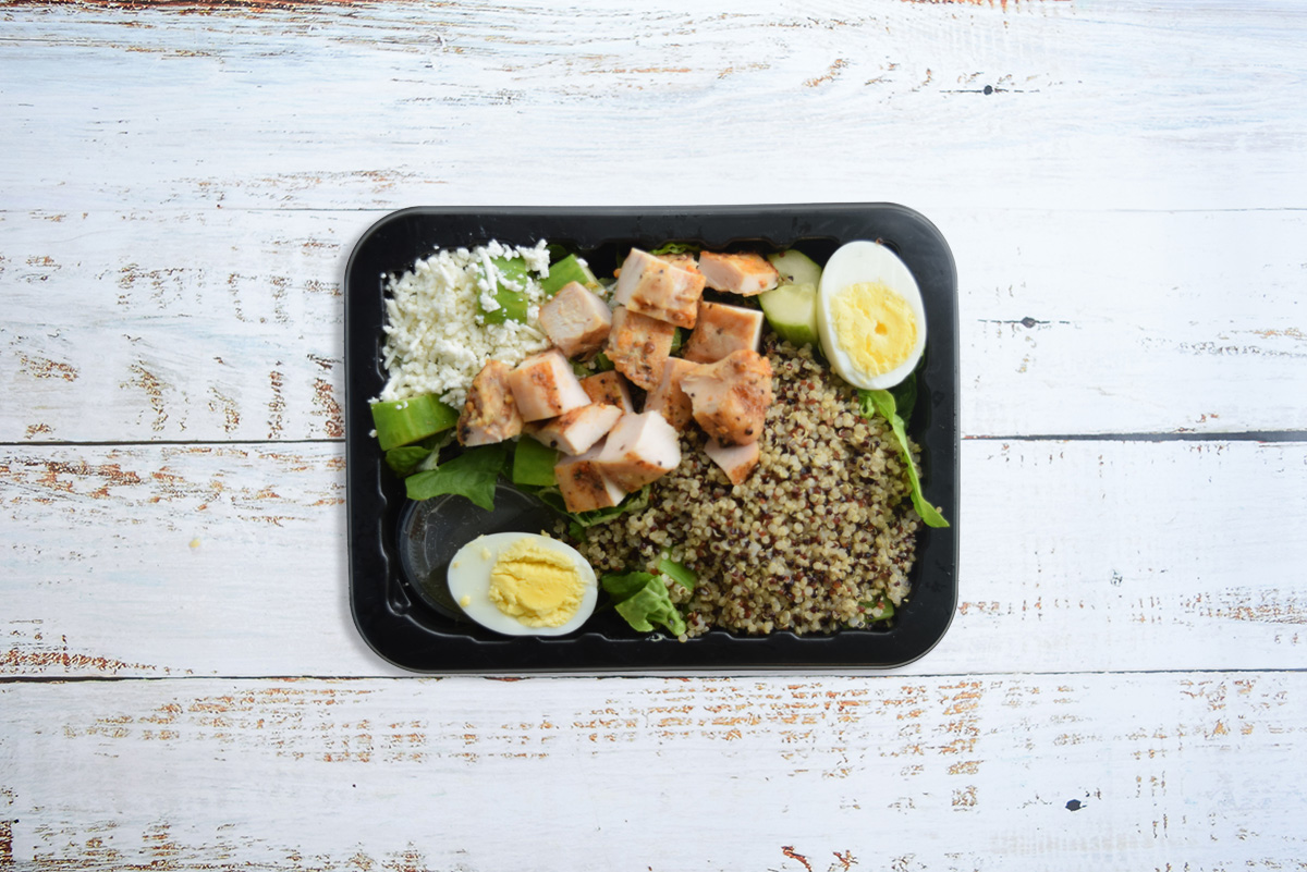 Chicken breast, Italian seasonings, chili powder, garlic powder, cayenne pepper, black pepper, celery salt, olive oil, organic tricolour quinoa, cucumber, feta cheese, hard boiled egg, romaine lettuce, olive oil, balsamic, herbs & spices