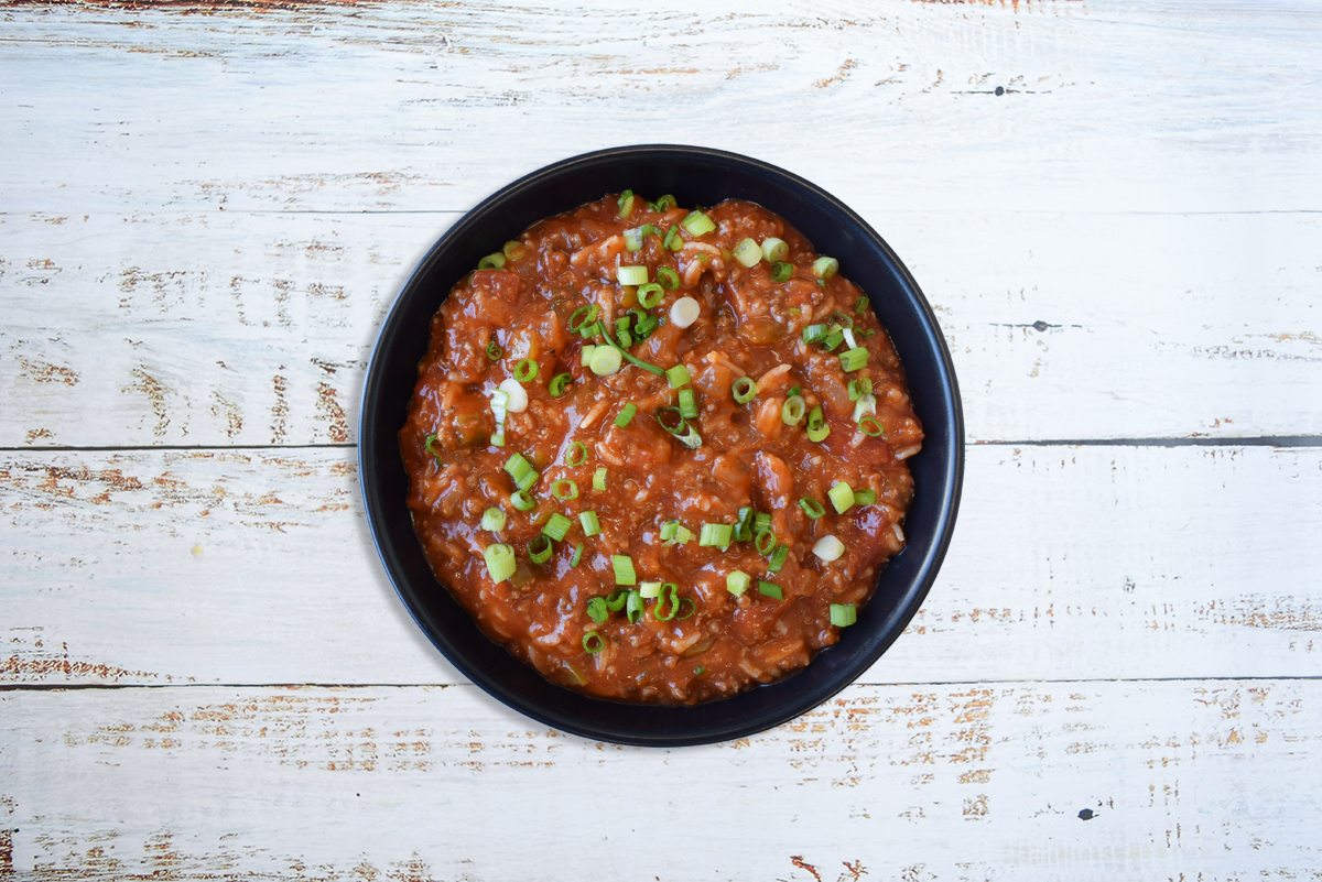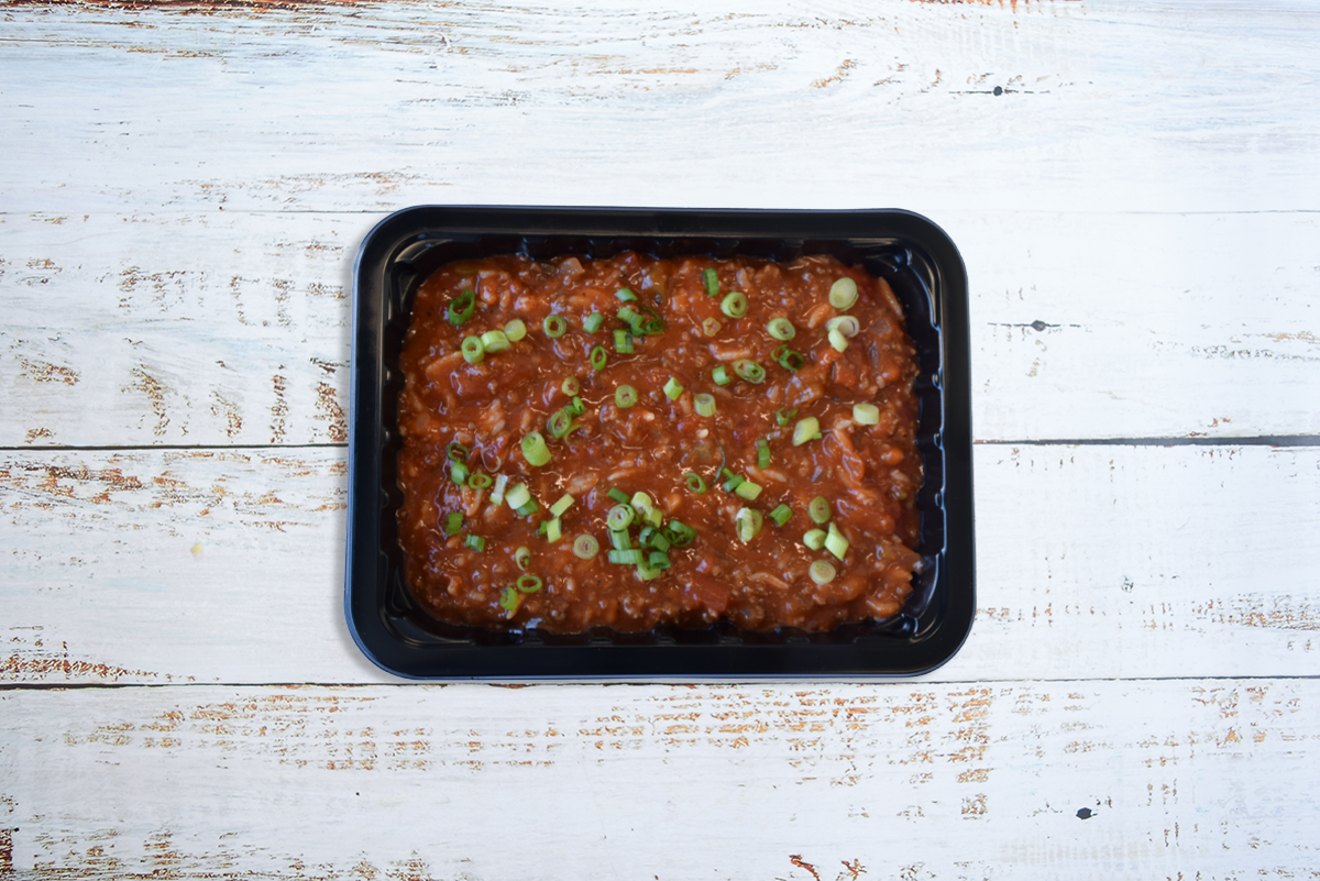 Hearty and cozy – Lean ground beef slow cooked with green bell peppers, tomatoes, herbaceous spices & jasmine rice topped with spring onion
