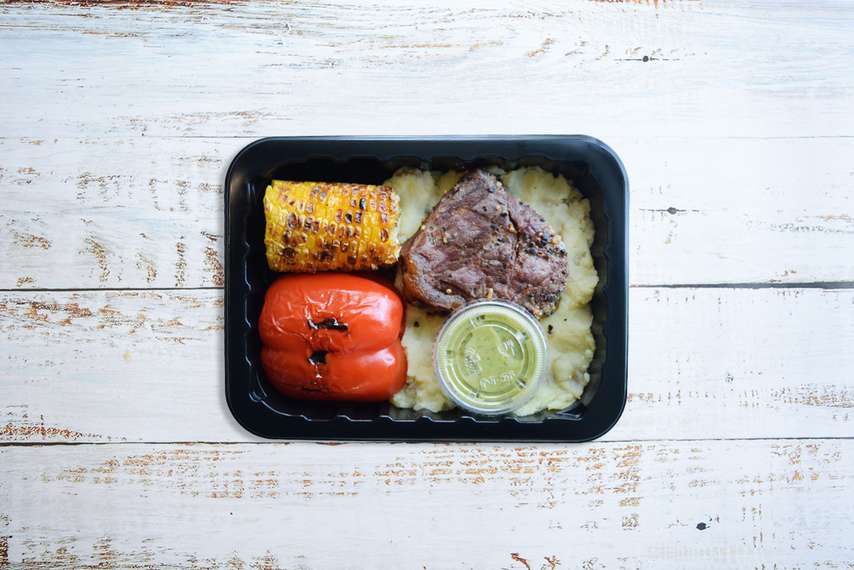 Tender Manhattan cut NY steak seasoned and grilled to perfection over classic golden potato mash with grilled corn, charred red bell pepper & house made chimichurri