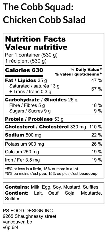 Rossdown halal chicken breast, pork bacon, egg, Romaine lettuce, green onion, grape tomatoes, corn, blue cheese, milk, sour cream, white wine vinegar, honey, garlic powder, salt, black pepper, light mayonnaise (water, soybean oil, modified cornstarch, sugar, corn, maltodextrin, liquid whole egg, vinegar, salt, liquid egg yolk, mustard, lactic acid, potassium sorbet, phosphoric acid, dried onion, dried garlic, calcium disodium EDTA, spice), herbs & spices