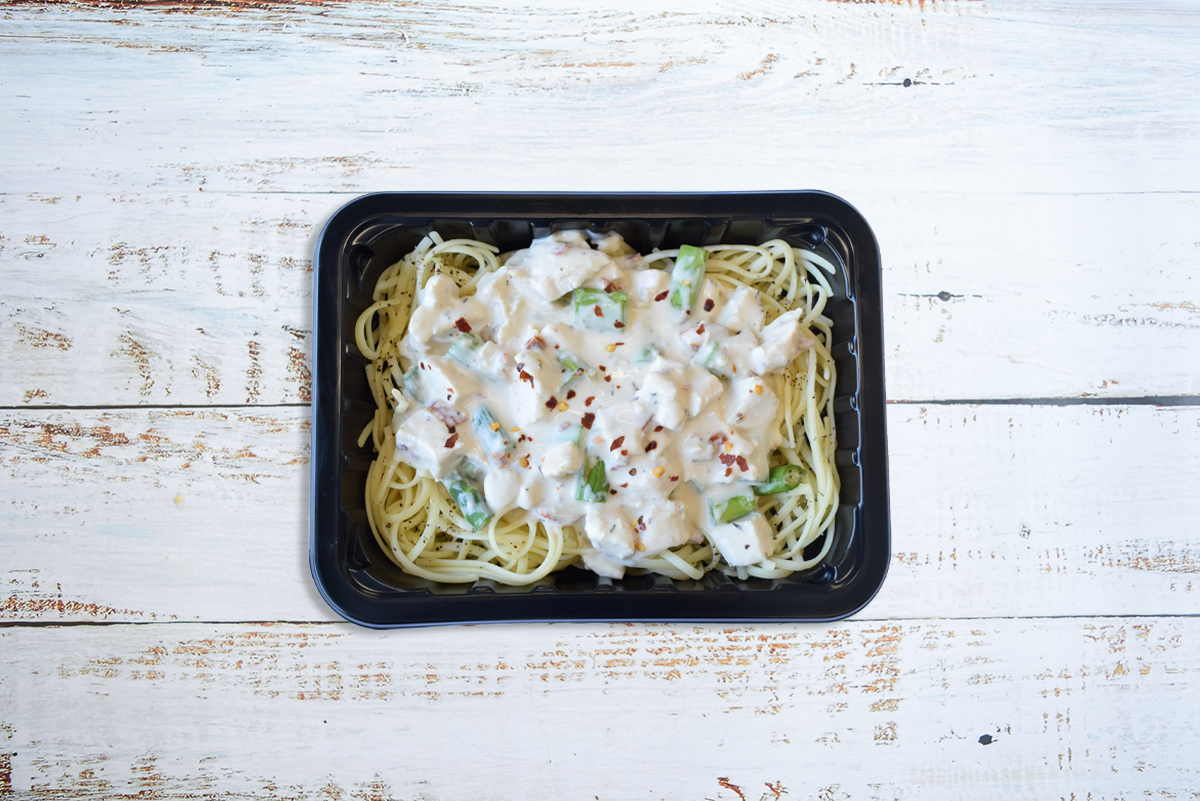 Rossdown Halal chicken breast, gluten free flour (garbanzo bean flour, potato starch, tapioca flour, white sorghum flour, fava bean flour), olive oil, salt, black pepper, vegan butter, garlic, filtered water, coconut milk, chili flakes, thyme, sun-dried tomatoes, basil, parmesan cheese, asparagus, gluten free linguine pasta (white rice flour, brown rice flour, corn flour, quinoa flour, mono and diglycerides), herbs & spices