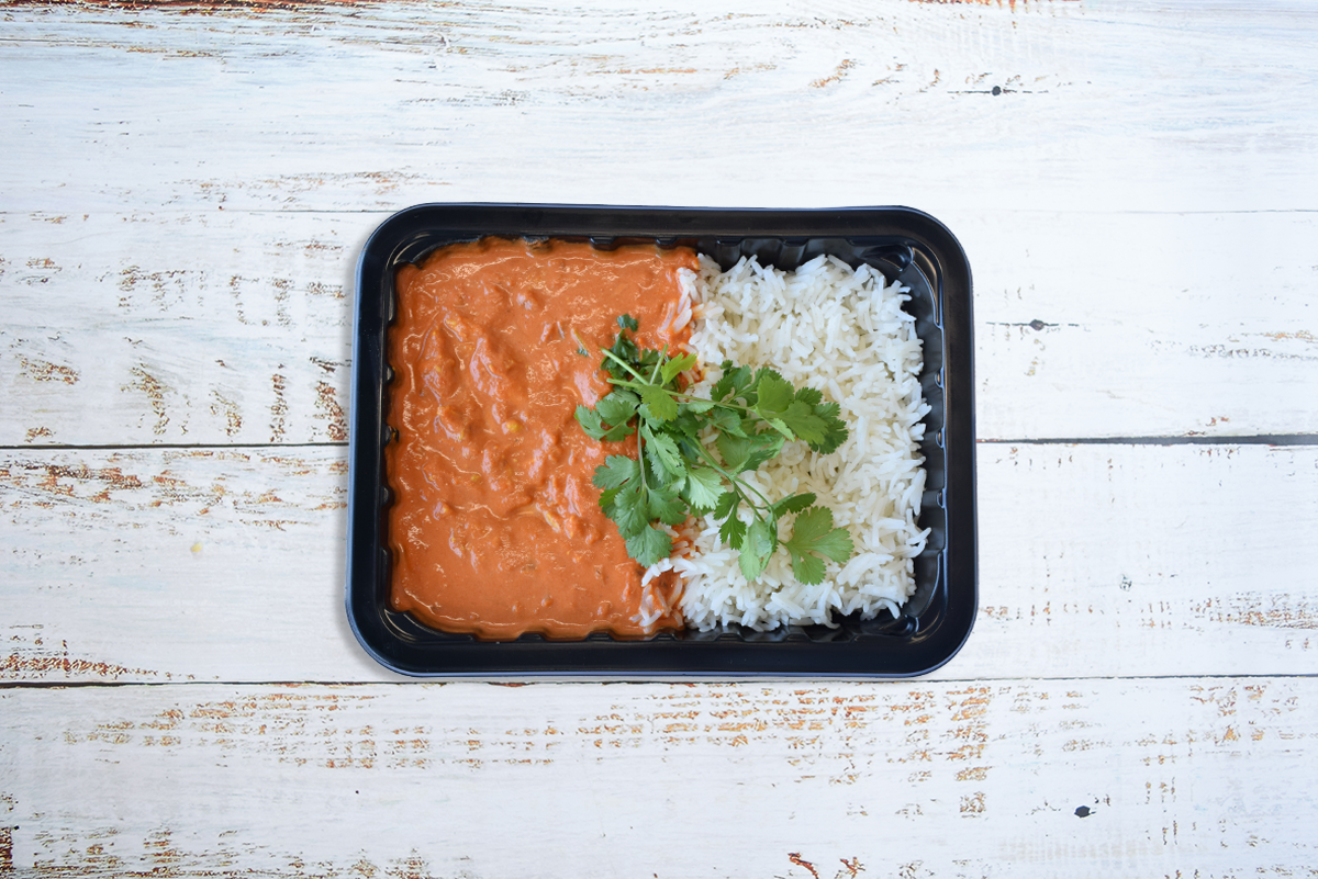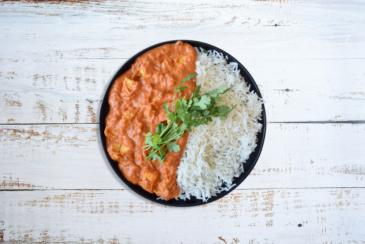 Rossdown halal chicken breast, garlic, ginger, garam masala, coriander, cumin, tomato paste, Greek yoghurt, salt, vegan butter, onion, chili flakes, tomato puree, coconut milk, cilantro, white jasmine rice, herbs & spices