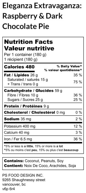 Hover For Ingredients Organic gluten free oats, organic unsweetened almond milk, brewed coffee, organic raw cocoa powder, vanilla, salt, maple syrup, dairy free yoghurt, raspberries, shredded coconut, almonds, dark chocolate (unsweetened chocolate; sugar; cocoa butter; soy lecithin, sunflower lecithin, canola lecithin; natural vanilla flavour) (chocolate is processed in a facility that contains milk)5.00 out of 5$12.49 Vegetarian